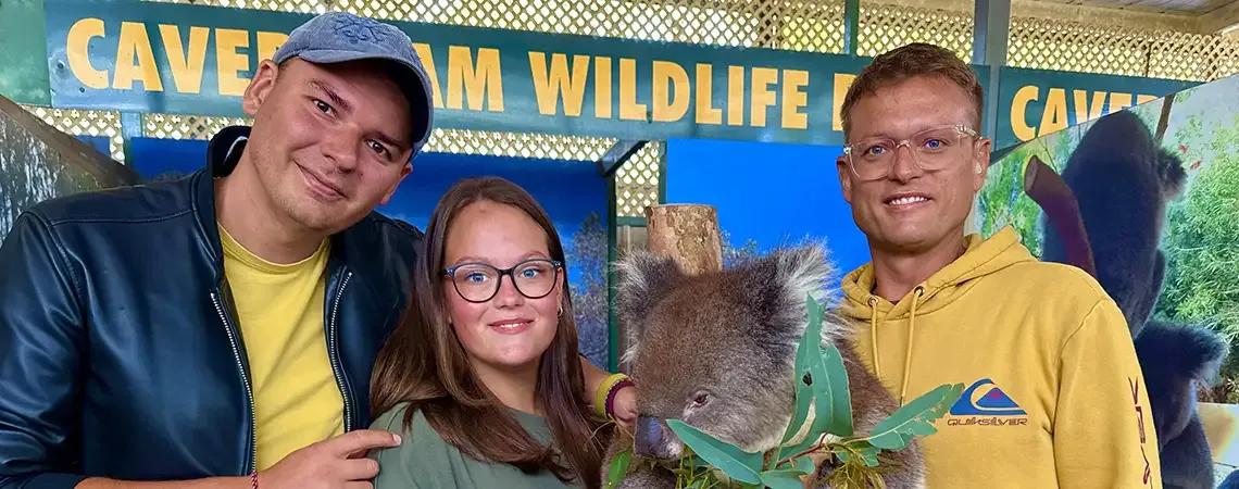 Nezapomenutelným zážitkem pro nás byla návštěva Caversham Wildlife Parku, kde jsme se setkali s klokany – mohli jsme je krmit a pohladit. Stejně tak jsme viděli desítky koal. Měli jsme štěstí, že jsme se dostali blíž ke koale a mohli se s ní vyfotit. Ten kontakt byl zážitkem na celý život. Austrálie je však jiná i cenově – výlety jsou drahé, jízda taxíkem trvá desítky minut a stojí stovky korun. V srpnu tu bylo chladno a deštivo kolem 15–20 °C, zatímco na Bali panovaly tropy. Přesto jsme byli vděční, že jsme mohli poznat Austrálii, její kulturu a zvířata.
