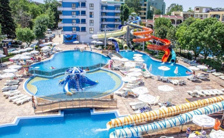 584 pokojů, 3 budovy, vstupní hala s recepcí, trezor za poplatek (6 BGN/den), výtahy, restaurace, bar, lobby bar, obchody. V zahradě 2 bazény se skluzavkami, bar u bazénu, terasa s lehátky a slunečníky zdarma, osušky oproti kauci.