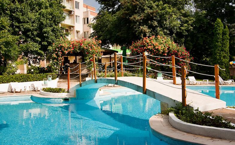 Hotel v mírném svahu v zeleni nad centrem letoviska, restaurace, obchody a bary v blízkosti. Letiště Varna 25 km.