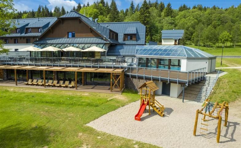 | recepce, restaurace se zimní zahradou a terasou s výhledem na Orlické hory, bar, konferenční sál, salónek, wellness (bazén s protiproudem a masážními tryskami, vířivka, finská sauna, bylinná a parní sauna, Kneippův chodník, venkovní ochlazovací bazén, lehátka v odpočívárně i u bazénu a za poplatek výběr relaxačních masáží), bowling (2 dráhy), dětský koutek, úschovna kol/lyží, v nejbližší době bude otevřeno i venkovní dětské hřiště a venkovní posilovna pro dospělé, multifunkční hřiště. |