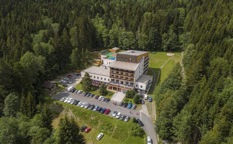| recepce, restaurace a jídelna, denní bar, salónky, Wi-Fi (zdarma), zimní zahrada k posezení, venkovní posezení, ohniště, konferenční služby, vnitřní bazén (12,5 x 6,5 x 1,5 m, 26-28 st. C) s malým whirlpoolem a sluneční terasou, wellness služby a masáže (za poplatek), fitness, úschovna kol a lyží, uzamykatelná schránka na lyže (za poplatek), stolní tenis, biliárd, bowling (za poplatek), tělocvična, pro děti: stolička, dětská herna s interiérovým dětským hřištěm, v létě venkovní hřiště, trampolína, atrakce a skákací hrad před hotelem; lanové centrum (za poplatek), venkovní workoutové hřiště, víceúčelové hřistě na tenis a badminton, parkoviště, akceptace platebních karet. WELLNESS (za poplatek): Vnitřní část: finská sauna, infra sauna, pára, whirlpool, masérna, odpočívárna. Venkovní část: finská sauna, bio sauna, 2x venkovní whirlpool, ochlazovací jezírko, odpočívárna, kamenné sprchy). Masáže je zapotřebí objednat 1 den předem. Osušky, župany a prostěradla do sauny je možno za poplatek zapůjčit na recepci. |
