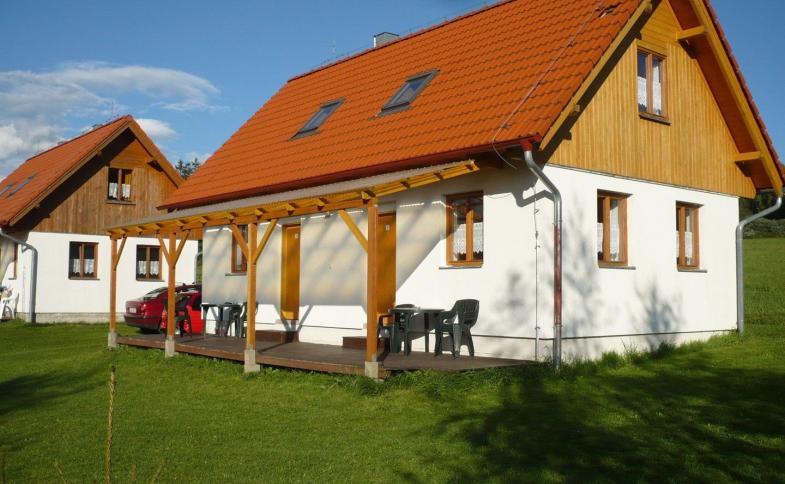 V každém domku jsou 2 rodinné apartmány pro 5 osob, se samostatnými vchody a společnou zastřešenou terasou s plastovým nábytkem. V přízemí je předsíňka, sprcha, WC a obytná kuchyně se 2 lůžky, jídelním koutem s kuchyňskou linkou (lednička, dvouplotýnkový el. vařič, mikrovlnka, varná konvice, nádobí, příbory) a kamna na dřevo (dřevo na požádání zdarma). Z předsíňky vedou dřevěné příkřejší schody do 1. patra, kde je podkrovní ložnice se 3 lůžky. Kompletní úklid apartmánů se provádí před nástupem, během pobytu vlastní úklid (úklidové prostředky k dispozici).Ručníky nejsou součástí vybavení.