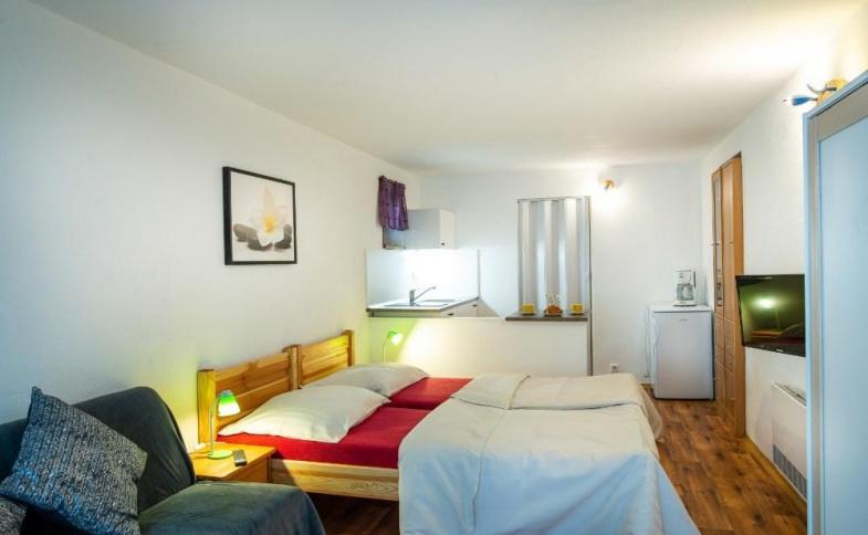 | Zelený pokoj, s možností přistýlky, vlastní sociální zařízení (WC, sprchový kout), 1 ložnice (1x dvoulůžko, 1x jednolůžko), kuchyňský kout, TV, Wi-Fi (zdarma), bezbariérový. Žlutý pokoj, vlastní sociální zařízení (WC, sprchový kout), 1 ložnice (1x dvoulůžko), lednice, TV, Wi-Fi (zdarma). Oranžový pokoj, vlastní sociální zařízení (WC, sprchový kout), 1 ložnice (1x dvoulůžko), TV, Wi-Fi (zdarma). Modrý pokoj, vlastní sociální zařízení (WC, sprchový kout), 1 ložnice (2x jednolůžko), TV, Wi-Fi (zdarma), výhled do ulice. Studio 1, s možností přistýlky, vlastní sociální zařízení (WC, sprchový kout), 1 ložnice (1x dvoulůžko, rozkládací pohovka), kuchyň (rychlovarná konvice, mikrovlnná trouba, lednice), TV, Wi-Fi (zdarma), terasa, výhled do zahrady. Studio 2, s možností přistýlky pro 3 osoby, vlastní sociální zařízení (WC, sprchový kout), 1 ložnice (1x dvoulůžko, rozkládací pohovka), kuchyň (rychlovarná konvice, mikrovlnná trouba, lednice), TV, Wi-Fi (zdarma), terasa, výhled do zahrady. |