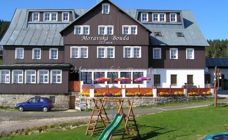 | Rodinné ubytování na vrcholcích Krkonoš s lyžařskými vleky přímo u objektu. Moravská bouda je jedna z nejhezčích a nejzachovalejších hřebenových horských boud. Jako jedna z mála si zachovala svou architektonickou autentičnost a historii doby vzniku, není zničena různými přestavbami v pohnuté době. Její součástí zůstává prostor restaurace s vyřezávaným lustrem z roku 1932 s motivy venkovského života. I rekonstrukce celého objektu byla provedena citlivě s ohledem na jeho historii. V roce 1982 byla Moravská bouda jednou z filmových lokací při natáčení filmové komedie Sněženky a machři - natáčely se zde některé interiérové scény. |