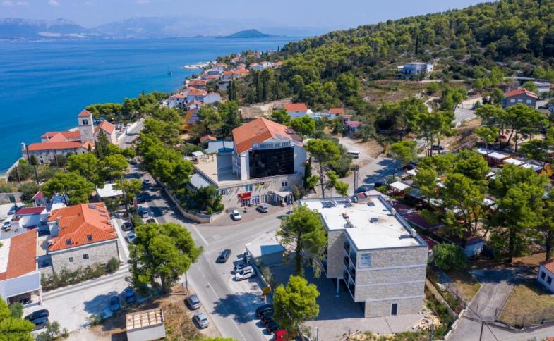 | Hotel se nachází přímo u oblázkové pláže Arbanija, pouze přes pobřežní ulici. Na pláži se lze občerstvit v koktejlových barech. |