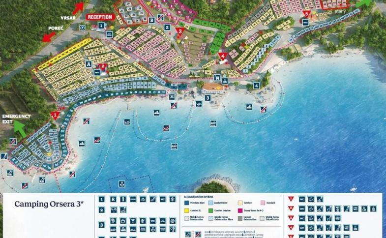 | Victoria mobilní dům Lux jsou umístěny terasovitě nad recepcí kempu, asi 200 m od pláže. Mobilní domy č. 11-14 jsou umístěny v zóně A, kaskádovitě na terasách, v blízkosti stanů CK Victoria. Zóna A je za příplatek. Victoria zařízený stan jsou postaveny v polostínu stromů, asi 200 m od pláže. |