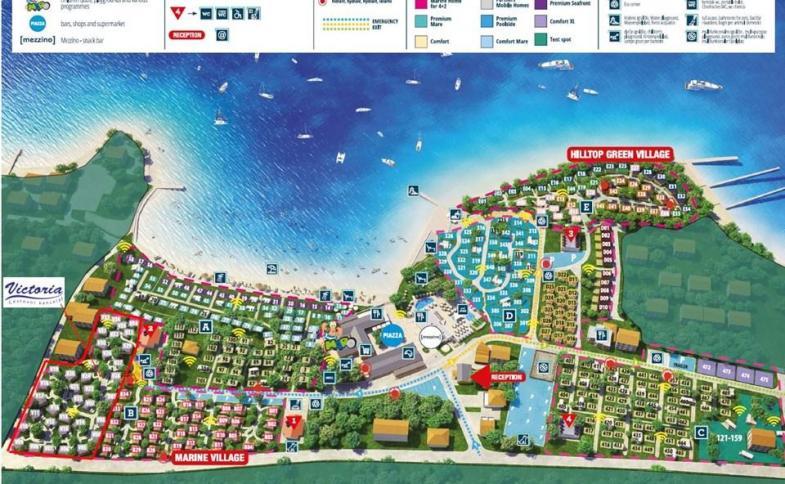 pláže! Victoria mobilní dům Premium Exclusive Chalet jsou umístěny cca 50 m od pláže. Zóna A je za příplatek. Parkování vozidel je zajištěno na vyhrazené ploše v kempu, za recepcí, cca 400 m od mobilních domů Victoria. |