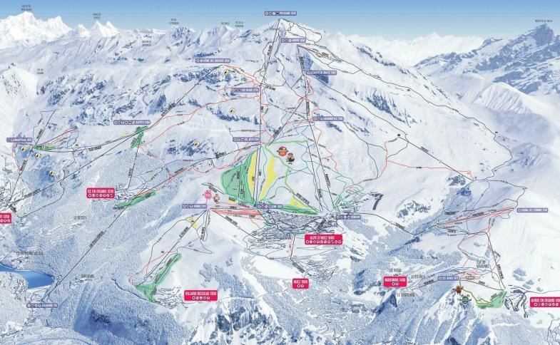 - dvě černé sjezdovky: La Sarenne, s délkou 16 km, jedna z nejdelších na světě a Le Tunnel