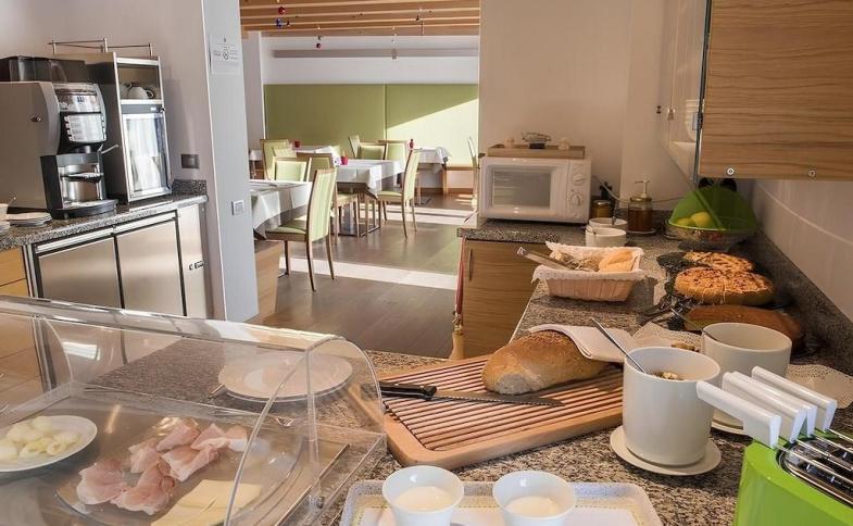 | Polopenze: bohatý snídaňový bufet (7:30 - 10:00) s regionálními produkty včetně domácích džemů a koláčů a čerstvého ovoce přímo z farmy. Večeře (19:00 - 20:30) formou tříchodového menu dle trentinských tradic. Jídla se připravují převážně ze surovin z vlastní farmy nebo od místních producentů. Velká část surovin používaných v kuchyni pochází přímo ze zahrady hostitelské rodiny. Patří mezi ně kalná jablečná šťáva z jablek z vlastní farmy a džemy z domácího ovoce, jako jsou broskve, meruňky a švestky. Na jídelním lístku jsou také vejce od slepic z farmy a sezónní zelenina z farmy. |