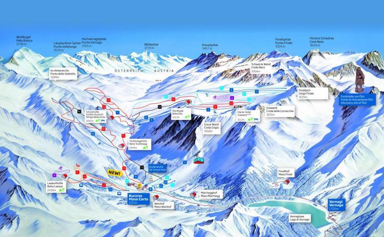 | - jeden z mála italských ledovcových areálů lákající 27 kilometry perfektně upravovaných tratí#- visutá kabina z městečka Maso Corto do závratné výšky 3.212 m n. m. za pouhých 6 minut#- díky ledovci a extrémní nadmořské výšce stabilní lyžařské podmínky a skvělý pevný sníh i se sluníčkem v dubnu#- liduprázdné sjezdovky s převažujícími "černými" aneb zde opravdu není přeplněno ani v hlavní sezóně#- atraktivní 8 km dlouhý Schmugglerabfahrt neboli "pašerácký sjezd" vedoucí až do údolí#- pár sezón zpátky nová 10místná kabinka Lazaun#- předloňskou novinkou sjezdovka propojující ledovec se sektorem Lazaun, umožňující zároveň pohodlnější přístup na lyžích k ubytovacím kapacitám#- od sezóny 2018/19 nová 550 metrů dlouhá černá závodní pista "Leo Gurschler" na ledovci se sklonem až 60 % pro opravdové experty#- široké červené a modré pisty přátelské k méně ambiciózním lyžařům#- menší, příjemný a zpravidla zcela prázdný svah u nové kabinky Lazaun jako alternativa pro případ špatného počasí na ledovci#- dva menší modré svahy Glocken 1 a 2 pro začátečníky a jako základna instruktorů lyžařských škol #- lyžařská škola pro děti Ötzilino přímo u dolní stanice kabiny#- 3,3 km dlouhá sáňkařská dráha pro pobavení dětí i dospělých#- pro vyznavače běhu na lyžích upravována na podzim trať Hochjoch na ledovci, v zimě pak okruh Lazaun #- atraktivní výlety na sněžnicích k místní zajímavosti v podobě ledovcové jeskyně#- několik útulných horských chat vybízejících k ochutnání lokální jihotyrolské kuchyně#- kuriozitou nejvýše položený horský hotel v Alpách, Berghotel Grawand#- zde v roce 1991 náhodně turisty nalezeny více než 5 tisíc let staré ostatky pravěkého člověka "Ötziho", dnes uložené v muzeu v Bolzanu |