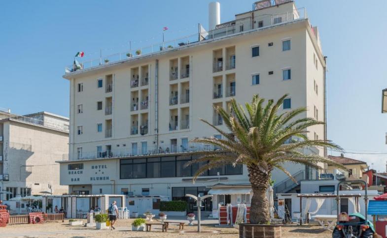 | Rimini je velmi živé středisko Adriatické riviéry, nabízí množství sportovních, kulturních, nákupních a relaxačních aktivit. 15 km jižně od Rimini, u Riccione, je největší italský aquapark Acquafan, 40 km severně u Raveny je největší italský zábavní park Mirabilandia. V Rimini navštívíte historické centrum, delfinárium, Itálii v miniatuře, nabízí se výlet do San Marina aj. Hotel BLUMEN leží na klidném místě přímo u privátní pláže a přitom nedaleko obchodů a restaurací. Klientům je k dispozici recepce s trezorem, výtah, bar, společenská místnost s TV, restaurace s výhledem na moře, Wi-Fi, animace na pláži, dětské hřiště a parkoviště (zdarma, omezená kapacita, nelze objednat předem). |