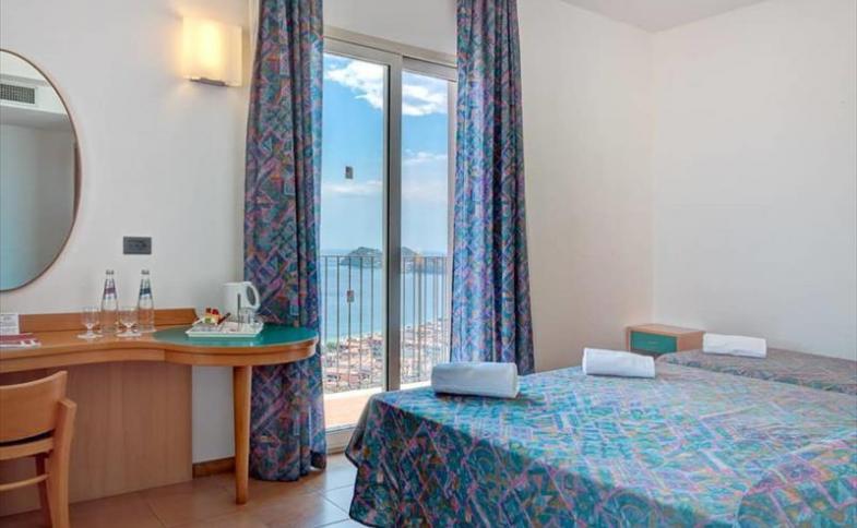 Široká, písčito-oblázková veřejná pláž s oddělenou částí pro hotelové hosty, na kterou se dostanete panoramatickým proskleným výtahem, který na pláž sjíždí podél kopce a pak se na ni dostanete pěšky asi 300 m. Plážový servis je zpoplatněn na místě. Výtah obsluhuje tři sousední hotely (Olimpo - Le Terrazze - Antares) na trase. . |