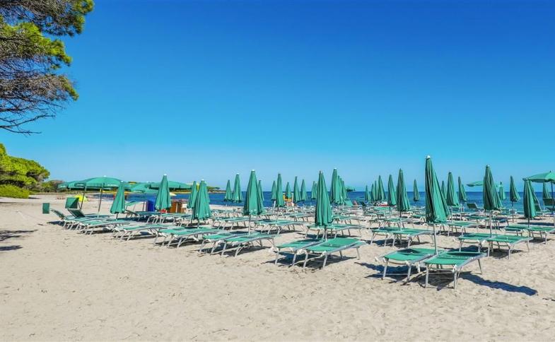 | Krásná široká pláž s jemným pískem a pozvolným vstupem do moře obklopená borovicemi se nachází cca 300 m od komplexu. Je vybavena plážovým servisem od 3. řady v ceně - 1 slunečník a 2 lehátka/pokoj (1. a 2. řada na vyžádání a za poplatek na místě). Plážové osušky za poplatek, na kauci. Na pláži je bar a toalety (externí společnost). Jednotlivé pláže v této oblasti střídají menší zátoky ohraničené žulovými a čedičovými skalami. |
