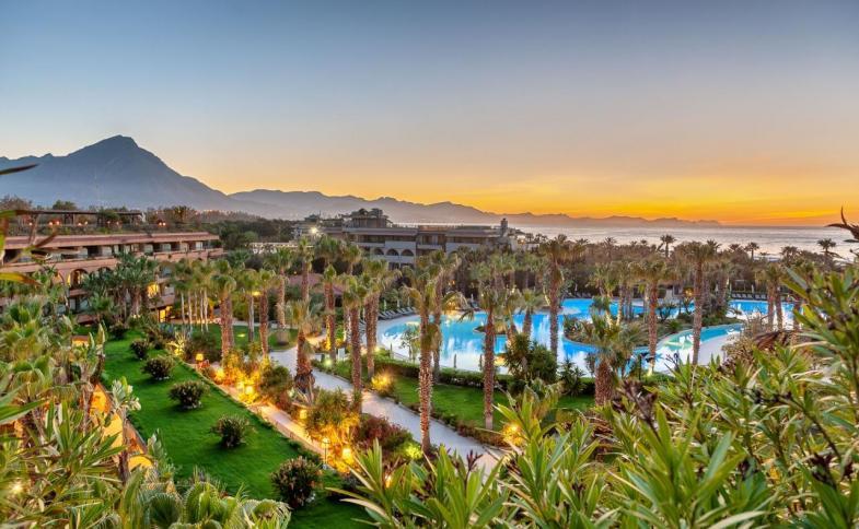 Recepce, hotelová hala, hlavní restaurace (se stoly i venku), bar u bazénu, piano bar, butik, sluneční terasa. Dva bazény, včetně velkého se zajímavým nepravidelným tvarem pro dospělé a brouzdaliště pro děti. Slunečníky a lehátka u bazénu zdarma. Osušky k dispozici po zaplacení zálohy cca 20 EUR (cca 3 EUR/výměna).