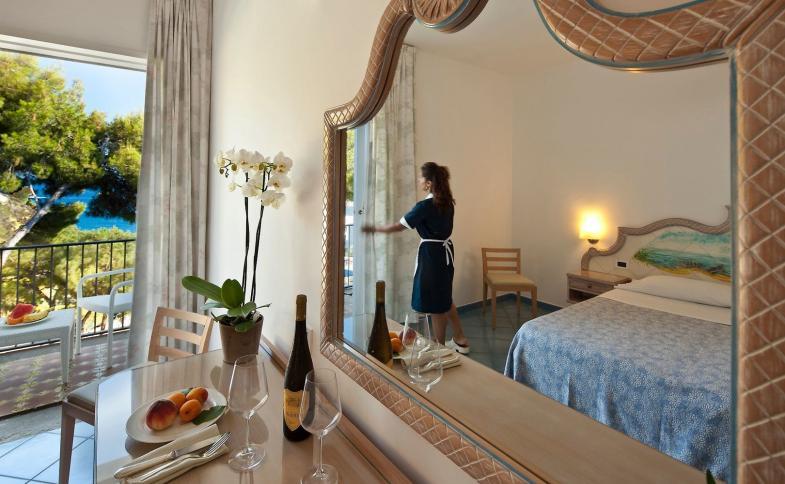 V pokojích je klimatizace, ústřední topení a koupelna. Hosté si mohou odpočinout na vlastním balkóně nebo na terase. Většina pokojů má výhled na moře. Pokoje mají dvoulůžkovou postel nebo queen size manželskou postel. Je možné požádat o přistýlku. Také je zde sejf a minibar. Hosté mají k dispozici žehlič kalhot. K základnímu vybavení patří připojení k internetu, telefon, televize a WiFi (zdarma). V koupelnách je sprchový kout a vana. Je zde vysoušeč vlasů. V objektu jsou pokoje pro rodiny a nekuřácké pokoje.