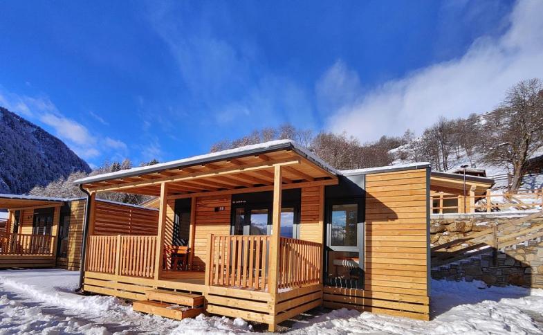 vybaveno #bilo 4/5 Bungalov: 35 m² - 1 ložnice s manželskou postelí, 1 ložnice s palandou a případně 1 samostatným lůžkem, obytná kuchyň, sociální zařízení, terasa #Mountain Chalet 4+1: 40 m² - 1 ložnice s manželskou postelí a 1 samostatným lůžkem, obývací pokoj s kuchyňským koutem a rozkládacím gaučem pro 2 osoby, sociální zařízení, terasa; maximální obsazenost apartmánu jsou 4 dospělí a 1 dítě do nedovršených 12 let; nové, velmi pěkně a moderně vybaveno |
