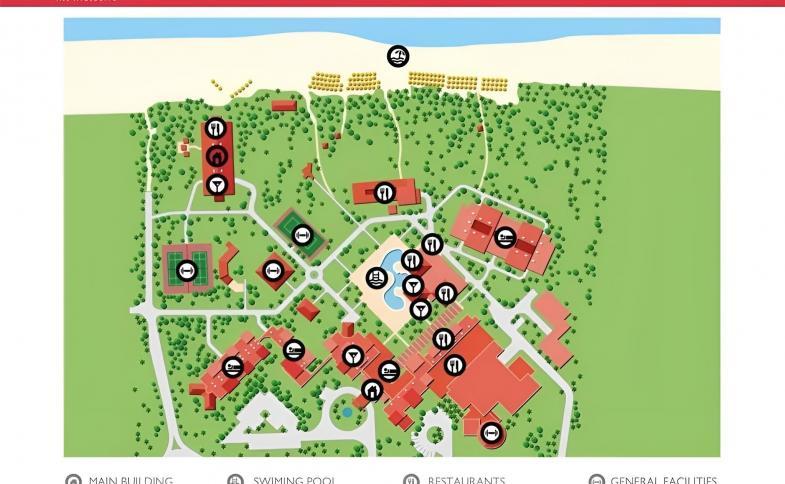 Hotel pochází z roku 1995. Do většiny poschodí lze vyjet výtahem. V objektu je úschovna zavazadel, hotelový sejf a směnárna. Přes WiFi se mohou hosté připojit k internetu. Na rezervační přepážce vám rádi pomůžeme s výběrem a rezervací výletů Objekt má celou řadu zařízení pro handicapované. Nachází se zde několik stravovacích zařízení, například restaurace, kavárna, bar a plážový bar. Je tady supermarket a obchod se suvenýry a další obchody. V areálu je hezká zahrada a hřiště. Nachází se zde také TV místnost a knihovna. Ti, kteří přijeli vlastním autem, mohou parkovat na parkovišti. Dále je možné využít 24 hodinovou bezpečnostní službu, lékařskou službu, prádelnu a kadeřnictví. Při vyřizování obchodních záležitostí mohou hosté využít projektor.