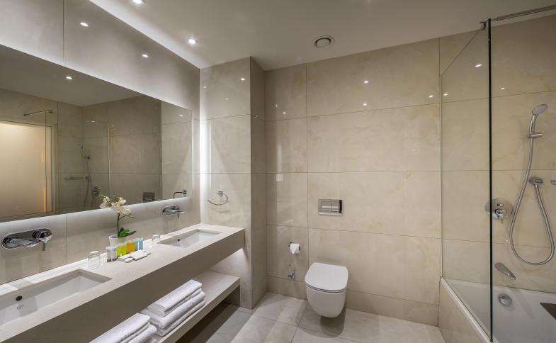 V pokojích je klimatizace, ústřední topení a koupelna. Hosté si mohou odpočinout na vlastním balkóně nebo na terase. Mnoho pokojů má výhled na moře, který vytváří příjemnou atmosféru. Pokoje mají manželskou postel typu king size a rozkládací pohovku. Je možné rezervovat oddělené ložnice. K dispozici jsou i postýlky pro kojence nebo přistýlky. Také je zde sejf, minibar a pracovní stůl. Hosté mohou použít ledničku, mini ledničku a varnou konvici/kávovar. Dále je zde sada na žehlení a žehlič kalhot. Na pokoji je připojení k internetu, telefon, televize, adapter do zásuvky a WiFi (zdarma). Pro hosty je na pokoji připravena domácí obuv. V koupelnách je sprchový kout, vana a vířivá vana. K dispozici mají hosté také vysoušeč vlasů a župan. Hosté naleznou v koupelnách kosmetické potřeby a výběr z několika typů ručníků. V objektu jsou pokoje pro rodiny a nekuřácké pokoje.