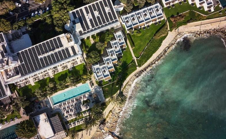 Menší písčitá pláž přímo u hotelu; veřejná, přístup přes pobřežní promenádu. Další pláž, Vrisoudia, cca 400 m od hotelu; veřejná, přístup po pobřežní promenádě, lehátka a slunečníky za poplatek.