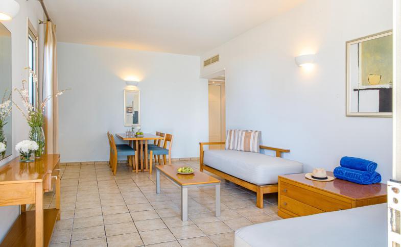 V pokojích je klimatizace, ústřední topení, obývací část a kuchyň. Většina pokojů má balkón s krásným výhledem. Mnoho pokojů má výhled na moře, který vytváří příjemnou atmosféru. Pokoje mají dvoulůžkovou postel a rozkládací pohovku. Je možné rezervovat oddělené ložnice. K dispozici jsou i postýlky pro kojence nebo přistýlky. Je tady sejf. Hosté, kteří se chtějí stravovat sami, zde najdou kuchyňský kout s ledničkou, vařičem, mikrovlnnou troubou a varnou konvicí/kávovarem. Hosté mají k dispozici sadu na žehlení. K základnímu vybavení patří připojení k internetu, telefon, televize, rádio a WiFi (zdarma). Pro hosty je na pokoji připravena domácí obuv. Komfortně vybavené koupelny mají vanu. K dispozici mají hosté také vysoušeč vlasů a župan. V hotelu jsou pokoje pro rodiny a nekuřácké pokoje.