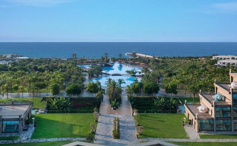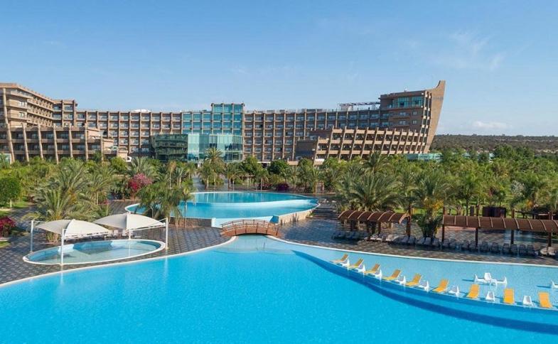 | celý areál hotelu se rozkládá na skutečně velké ploše (160 000 m2) sahající v přední části na pláž. V zadní části komplexu je vícepatrová hlavní budova a v centrální části pak areál bazénů a několik menších klubových objektů vsazených do rozlehlé udržované zahrady. V hlavní budově Vás uvítá elegantní recepce s lobby a barem, společenskou místností (WiFi ve společných prostorách zdarma), market, několik obchůdků a velké luxusní hotelové kasíno. Stravování obstarávají celkem 4 restaurace, k posezení poslouží celkem 8 kaváren a barů (vnitřní i venkovní). K relaxaci Vám bude k dispozici Karina Spa and wellness centrum s vnitřním bazénem, saunou, tureckými lázněmi, aromaterapií, masážemi aj. Venkovní prostory skýtají dostatek prostoru, jsou zde celkem 3 bazény (včetně dětského) a hotel disponuje vlastním aquaparkem pro děti i dospělé. Lehátka a slunečníky rozmístěné v zahradách, areálu bazénů i na pláži jsou hostům k dispozici zdarma. Ke sportování Vám poslouží 4 tenisové kurty, multifunkční hřiště, minigolf, šipky, biliár, stolí tenis aj., k zábavě pak herna, diskotéka, kino či amfiteátr pořádající představení a zábavné programy pro všechny věkové kategorie. Nechybí dětský klub, diskotéka pro děti, dětské hřiště. Na pláži se nabízí možnost vodních sportů, plážového volejbalu či potápění. |
