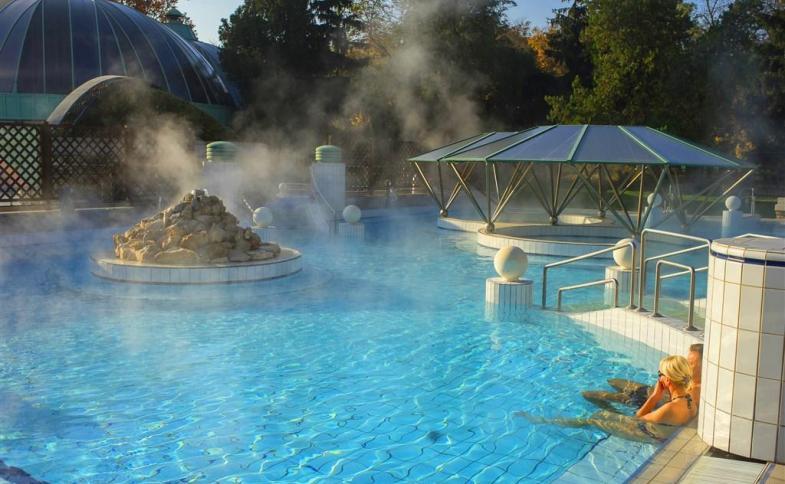 lázeň, aroma kabina, tropická sprcha). Z hotelové haly vstoupíte přímo do termálních lázní Egertermálfürdö (venkovní a vnitřní bazény s různě teplou a vysoce léčivou vodou cca 28 °C- 42 °C), bazény jsou napájeny ze dvou pramenů: první je lehce radioaktivní 28 °C - 29 °C a druhý 47 °C teplý, vyvěrá z hloubky až 1600 m a obsahuje hydrogenkarbonat, vápník a hořčík. Voda je vhodná pro léčení kloubového onemocnění, revmatických potíží, nemoci pohybového ústrojí, pooperační terapii a chronické pocení. |