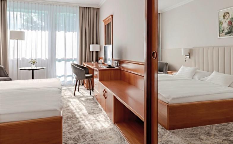 V pokojích je klimatizace, ústřední topení, kuchyň a koupelna. Většina pokojů má balkón s krásným výhledem. Pokoje mají koberec a je v nich dvoulůžková postel. K dispozici jsou i postýlky pro kojence nebo přistýlky. Je k dispozici sejf a pracovní stůl a za poplatek minibar. Ke standardnímu vybavení patří varná konvice/kávovar. Na pokoji je připojení k internetu, telefon, televize a WiFi (zdarma). Je možné rezervovat bezbariérové pokoje. V koupelnách je sprchový kout a vana. K dispozici je také vysoušeč vlasů a župan.
