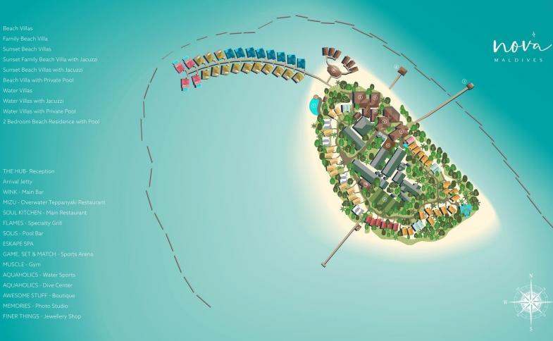 Nova Maldives se nachází v atolu South Ari na Maledivách a rozporostírá se přes celý ostrov až do Indického oceánu. Téměř kruhový ostrov o roměrech cca 210 x 240 m, obklopený krásnou písečnou pláží s bujnou tropickou vegetací. Bohatý korálový útesk jen pár metrů od břehu je domovem hejn pruhatců a netopýrníků. V oblasti se také nachází více než 35 potápěčských lokalit, na které se lze dostat lodí během 10-60 minut.Vybavení