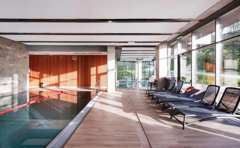 bazén s atrakcemi (8x 4,5 m), posilovna wellness: finská sauna, parní sauna, infračervená kabina, tepidarium, venkovní vířivka na terase, masáže a saunové rituály*, kosmetické služby* * služby za příplatek |