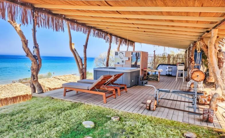 Písečnooblázková pláž před hotelem (při vstupu do vody oblázky), lehátka a slunečníky na pláži zdarma, privátní plážové chýše (za poplatek), bar na pláži v rámci all inclusive, známá pláž Banana Beach v pěší dostupnosti (cca 200m).Stravování