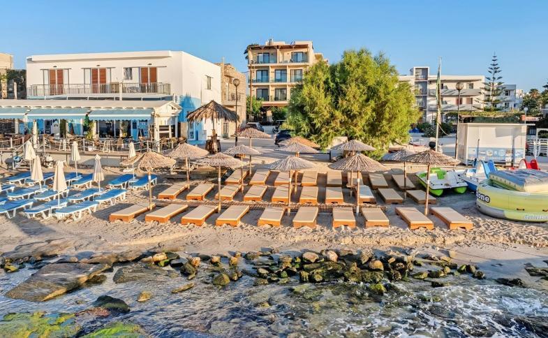 Písečnooblázková pláž cca 150 m. (při vstupu do moře kamenné plato, doporučujeme obuv). Lehátka a slunečníky za poplatek.Stravování