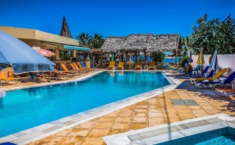 | hotel leží přímo u moře, jde o komplex atriového stylu skládající se z 11 samostatných budov. Nabízí svým klientům vše potřebné a je stranou rušné silnice protínající toto živé letovisko. Najdete zde 245 pokojů, jak samostatných pokojů pro 1-3 osoby, tak i rodinných (jedno či dvouložnicové) apartmánů až pro 6 osob. Pokoje prošly v zimě 2016 rozsáhlou rekonstrukcí a modernizací. Uvítáni budete menší recepcí, jejíž součástí je lobby část s TV a menším internetovým koutkem. V lobby i celém areálu hotelu je možnost WiFi intermetového připojení zdarma. Stravování je zajištěno v hlavní hotelové restauraci a ve 2 á la carte tavernách přímo u pláže, posezení pak ve 2 pool barech a 3 plážových barech. V hotelu najdete i malý obchod se suvenýry a minimarket. Zázemí hotelu disponuje squashovým kurtem, stolním tenisem, miniklubem a menším fitness centrem. Za příplatek si lze dopřát saunu, parní lázeň či vířivku. Venkovní areál je tvořen 4 samostatnými bazény (včetně jednoho dětského), prostornou sluneční terasou s lehátky a slunečníky zdarma (na pláži za poplatek). Plážové osoušky jsou nabízeny za poplatek. Cca 400 m od hotelu je i středisko vodních sportů, dráha na motokáry, možnost jízdy na koni aj. |