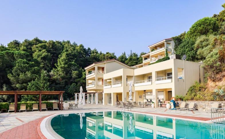 Hotel se nachází na jihu ostrova, cca 200 m od pláže a přibližně 150 m od zastávky autobusu. Hlavní město ostrova Skiathos town je vzdáleno přibližně 6 km. Letiště JSI je vzdáleno cca 7 km.