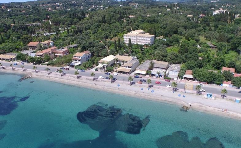 Na okraji střediska Ipsos, cca 400 m od centra. Podél pobřežní komunikace mnoho obchodů, barů a taveren. Hlavní město Korfu cca 15 km (spojení linkovým autobusem, zastávka cca 100 m). Letiště - 15 km Kerkyra