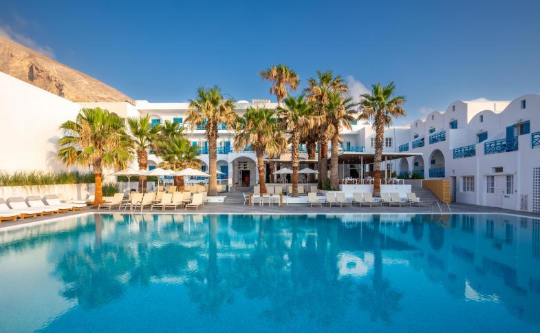 Hotel s polohou přímo u pobřežní promenády v centru letoviska Kamari, v okolí obchody, restaurace, taverny, butiky. Hlavní město Thira cca 8 km (dobré autobusové spojení). Letiště cca 7 km.
