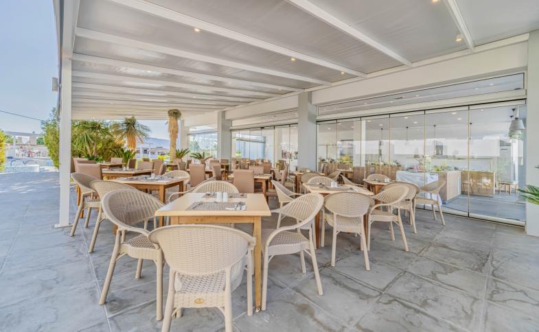 Písčitá s oblázky, pozvolný vstup do moře, lehátka a slunečníky za poplatek, plážový bar za poplatek.Stravování