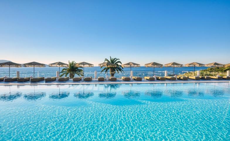 112 pokojů, hlavní a několik dvoupatrových vedlejších budov uspořádaných terasovitě v kopci směrem k pláži. V hlavní budově vstupní hala s recepcí, výtah, společenská místnost s TV/sat., minimarket, bar Esperos, hlavní restaurace Panorama, restaurace à la carte Simplicity, konferenční místnosti. Venku bazén, terasa na slunění s lehátky, slunečníky a osuškami zdarma a bar Lush u bazénu.