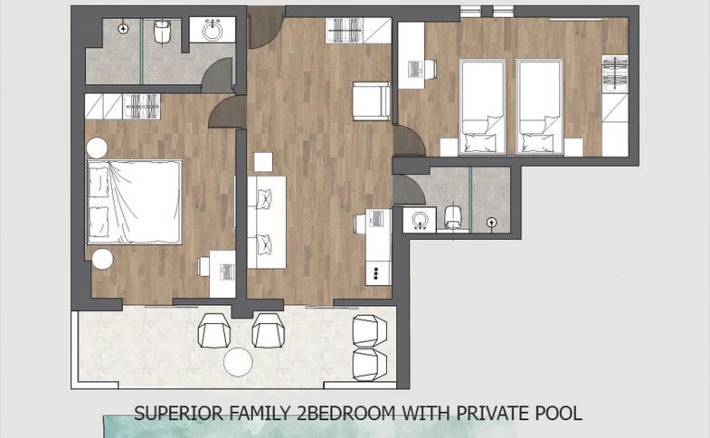 - Rodinný pokoj, Superior, 2 ložnice, Soukromý bazén: 2 ložnice a obývací část oddělená dveřmi, privátní bazén, trepky a župany, po příletu navíc lahev vína, lahev vody doplňovaná denně, velikost pokoje 45 - 55 m2, pokoje po rekonstrukci.