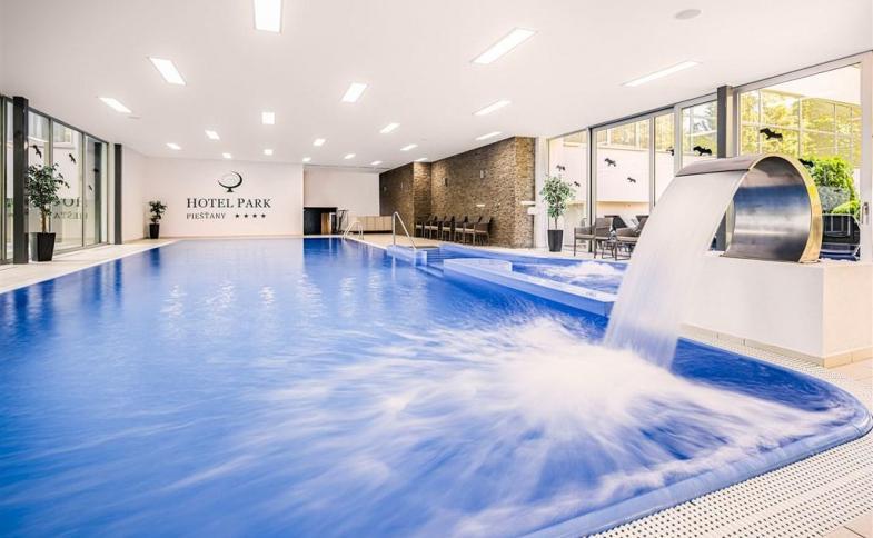 (kamery). Léčebné procedury: lékařská péče, masáže (klasické, reflexní, reflexní chodidel, lávovými kameny, ayurvedské, champi - indická masáž hlavy), měkké techniky, Breuss masáž, Feldenkrais metoda - pohyb s uvědoměním, lymfodrenáže, parafango zábaly, hydroterapie, elektroterapie, magnetoterapie, laseroterapie, oxygenoterapie, plynové injekce, kineziterapie a aquaaerobik, nordic walking, na lázeňském ostrově termální minerální koupele. Nové procedury hotelového balneocentra v útulnějších prostorách (kryoterapie, rebox physio, laseroterapie, ultrazvuk) a sirná koupel. WELLNESS: krytý bazén (30 °C) s vodními atrakcemi, NOVÁ vířivka pro 7 osob (91 trysek), parní, infra a finská sauna, relaxační místnost, letní terasa s lehátky, v létě fresh bar u bazénu Krátká videa o hotelu PARK **** Piešťany ZDE a ZDE |