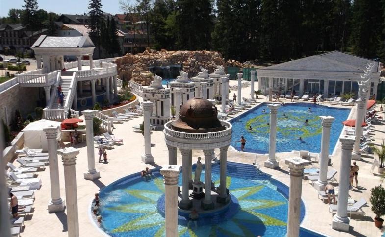 | Areál lázní tvoří několik hotelů, Vodní a Saunový svět, luxusní bar