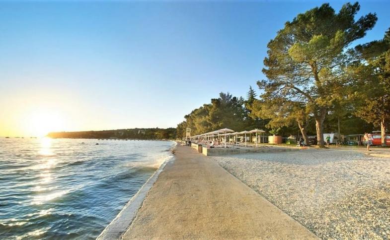 | travnatá pláž s oblázkovými a betonovými částmi, která nabízí stín borovic a perfektní přístup pro ty nejmenší. Resort nabízí venkovní bazénový komplex s mořskou vodou: plavecký bazén, dětský bazén se skluzavkou (otevřen dle podnebních podmínek od června do září). Lehátka a slunečníky na pláži a u bazénu za poplatek (v omezeném množství). |