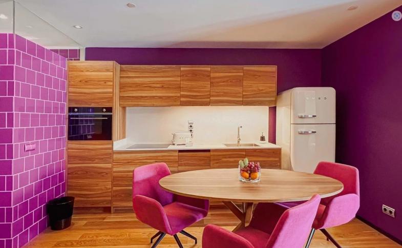 - opticky oddělený a vybavený kuchyňský kout: lednice s mrazákem, trouba s mikrovlnnou troubou, myčka nádobí, indukční varná deska, toustovač, nádobí