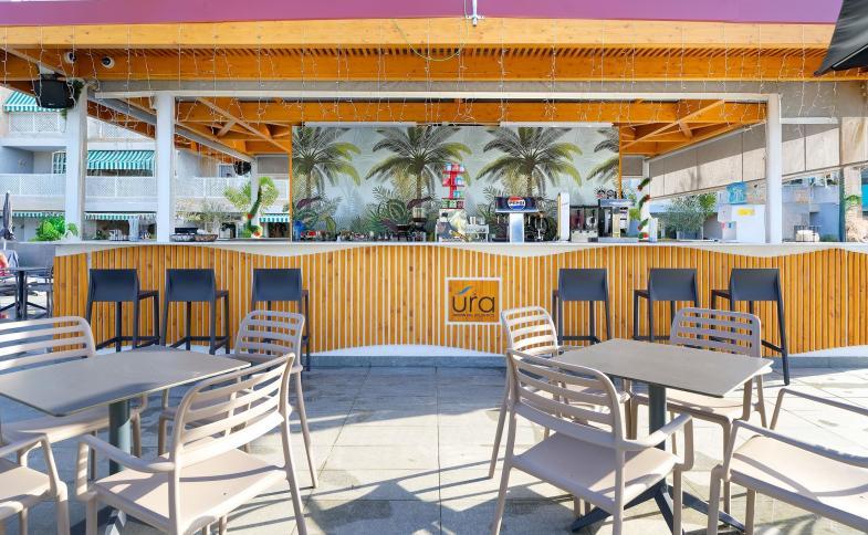 334 apartmá, 5 pater, 3 výtahy. Vstupní hala s recepcí, hlavní restaurace, snack bar, společenská místnost s TV/sat., minimarket, kadeřnictví. K venkovnímu vybavení patří 3 bazény (jeden s možností klimatizace/vyhřívání) a terasy na slunění s lehátky a slunečníky zdarma.