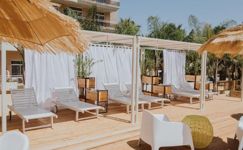 | samostatná teresa s bazénem, lehátky a barem pouze pro dospělé. |