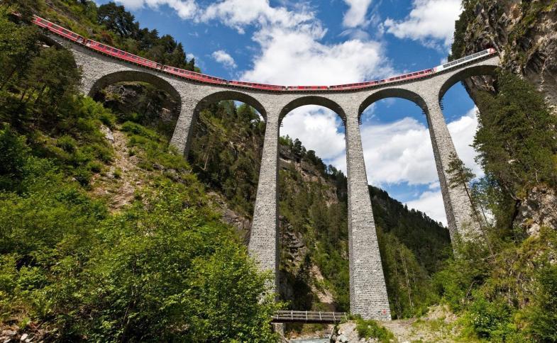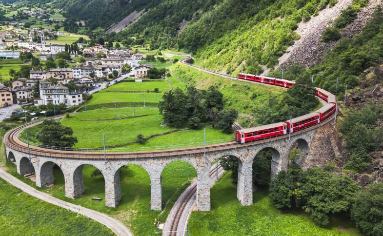 - Červenými vagónky Rhétské dráhy po trase slavného Bernina Expressu a Glacier Expresu do Sv. Mořice, světoznámého horského střediska. Dále přes průsmyk Bernina systémem velkoryse budovaných spirálových tunelů i jediného spirálového viaduktu na světě. Dále údolím východního Švýcarska Engadin zpět do Davosu.