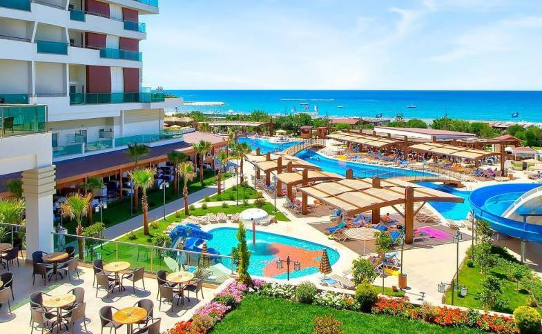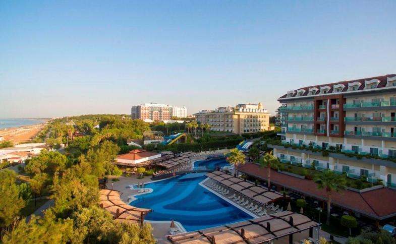 | Rozlehlý hotelový komplex tvoří 2 hlavní 5patrové ubytovací budovy a centrální část s bazény. V přední části areál přechází k pláži. Uvítá vás moderní prostorná vstupní hala, k dispozici dále budete mít: salónky, společenské prostory, minimarket, obchůdky, diskotéku, hernu, kadeřnictví, lékařskou pomoc, zasedací prostory, dětský koutek aj. Hotel má vlastní Spa/wellness centrum (900 m2) s vnitřním bazénem (120 m2, v provozu v zimní sezóně), hammamem, saunou, vířivkou, relaxační místností a nabídkou masáží a řady revitalizačních a kosmetických procedur. Stravovací služby bude obstarávat velká hlavní restaurace, dále 4 a´la carte tematické restaurace (italská, turecká, rybí a mexická). O příjemné posezení u kávy nebo nápoje se postará hned několik barů (snack/pool, beach, disko, lobby aj.). K pobavení a aktivnějšímu odpočinku lze využít hotelové fitness centrum, dále kulečník, šipky, hernu, volejbal, stolní tenis anebo využít nabídky hotelových animačních programů pro všechny věkové kategorie (zábava, soutěže, tematické večery, diskotéky). Na pláži můžete využít služeb střediska vodních sportů s řadou atrakcí. Venkovní část areálu vám nabídne velký hlavní bazén (800 m2), samostatný dětský bazén (40 m2) a menší aquapark se 3 skluzavkami (100 m2). Kolem bazénů jsou prostorné sluneční terasy s lehátky a slunečníky (zdarma, i na hotelové pláži, osušky proti záloze). Samozřejmostí je soukromé parkoviště (pro hosty zdarma). |