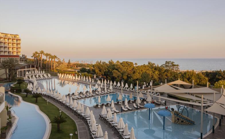 Celkem 336 pokojů na rozloze 80,000 m2, vstupní hala s recepcí, hlavní restaurace, 6 A la Carte restaurací (mořské plody, Turecká, jídlo z dálného východu a Italská zdarma 1x za pobyt s nutnou rezervací / Aqua Steak a Barbeque za poplatek s rezervací), 6 barů (The Bar, Ocean Cafe & Bar, Olive bar u bazénu, bar na pláži, Club House Lounge & Bar, Yasemin bar u bazénu pro 16+), 2x patisserie (Thea's Coffee Shop, Baska Ol), 5 venkovních bazénů - rodinný bazén, rodinný bazén s aktivitami, dětský bazén, bazén pouze pro dospělé 16+, bazén s jacuzzi pouze pro dospělé 16+, vnitřní bazény pro děti i dospělé, lehátka, slunečníky a osušky u bazénu zdarma, herna (za poplatek), nákupní arkáda, služby prádelny (za poplatek), pokojová služba (za poplatek), služby lékaře nebo zdravotní sestry (za poplatek), venkovní parkoviště (zdarma).Hotel je rozložený do 3 částí - pouze pro dospělé, pro všechny věkové kategorie (Mix část) a rodinnou část.