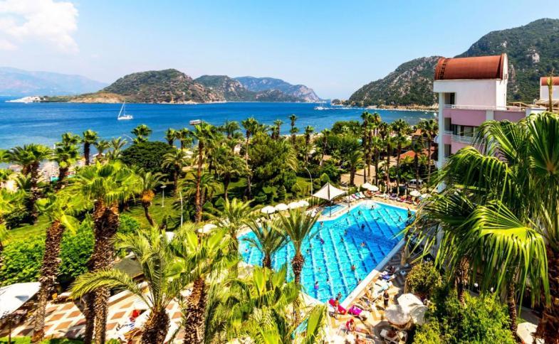 | Hotel rozléhající se na celkem 13 500 m2 se pyšní skvělou polohou přímo u dlouhé a široké písečné pláže s pozvolným vstupem do moře (v přilehlé části náleží hotelu jako soukromá, oceněna Modrou vlajkou) a to v turisticky oblíbeném letovisku Icmeler-Marmaris. 5hvězdičkový komfortní hotel s konceptem all-inclusive prošel v roce 2024 rozsáhlou rekonstrukcí, svým hostům nabízí nejen skvělou polohu, ale i snadnou dostupnost všech turistických služeb a jedinečnou vybavenost. Centrum střediska Icmeler je vzdáleno cca 200 m a letovisko Marmaris pouhých 7 km. Letiště Dalaman je vzdáleno 110 km. |