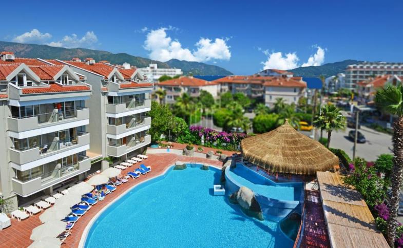 Apartmánový hotel pochází z roku 1998. Klimatizovaný hotel má 104 pokojů. Po příjezdu do objektu jsou hosté uvítáni ve vstupní hale s recepcí, která je otevřena 24 hodin. Check in/check out je možný 24 hodin. V apartmánovém hotelu je úschovna zavazadel, hotelový sejf a směnárna. Přes WiFi se mohou hosté ve společných prostorách připojit k internetu. Na rezervační přepážce vám rádi pomůžeme s výběrem a rezervací výletů Nachází se zde několik stravovacích zařízení, například restaurace, jídelna a bar. V areálu je hezká zahrada a hřiště. Nachází se zde také TV místnost a dětská herna. Ti, kteří přijeli vlastním autem, mají k dispozici parkovací místa (zdarma). Hotel nabízí vícejazyčný personál, lékařskou službu, pokojovou službu, budící službu a prádelnu. Hosté mohou využít za poplatek shuttleservis.
