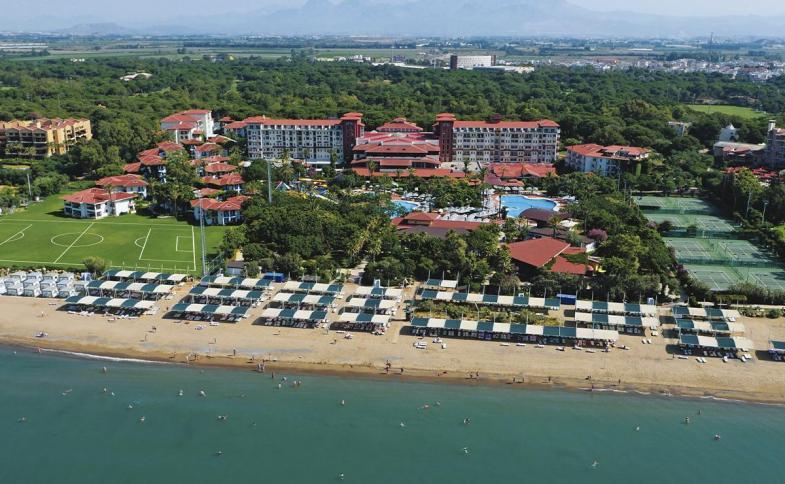 | Resort o celkové kapacitě 596 pokojů byl plně zrekonstruován v roce 2019, je tvořen hlavní budovou se dvěma 6patrovými ubytovacími křídly a 10 menšími klubovými budovami vsazenými do udržované zahrady skýtající příjemný stín stromů a přecházející v přední části komplexu k hotelové pláži. Ve vnitřních prostorách Vás uvítá elegantní a velice prostorná vstupní hala s lobby a barem, recepcí a výtahy. K dispozici Vám bude společenská TV místnost, několik malých salónku, konferenční sály s různou kapacitou a profesionálním vybavením, obchůdky, směnárna, dětský koutek aj. Nechybí wellness centrum se saunou, perní lázní, vnitřním bazénem, nabídkou různých druhů masáží a kosmetických či revitalizačních procedur, samozřejmostí je dobře vybavené fitness centrum. Stravovací služby a posezení u kávy či nápoje obstarává hlavní bufetová restaurace, dále 3 tematické a´la carte restaurace (rybí, italská, turecká), lobby bar, pool bar, beach snack bar, music bar a disco bar. Venkovní areál nabízí dva hlavní bazény (700-900 m2, jeden se 4 skluzavkami), 2 dětské bazény, řadu slunečních teras s lehátky a slunečníky (v ceně, stejně tak na pláži). Pro aktivnější pobyt hotel nabízí šipky, basketbal, vodní pólo, stolní tenis, minigolf, plážový volejbal, tenisové kurty, stolní fotbal, biliár. V rámci nabízených animačních programů lze absolvovat gymnastiku, pilates, aerobic a další nabízené aktivity pro všechny věkové kategorie. Samozřejmostí je dětský mini klub s pestrou nabídkou činností pro nejmenší hotelové hosty. Na pláži lze využít nabídku střediska vodních sportů. |